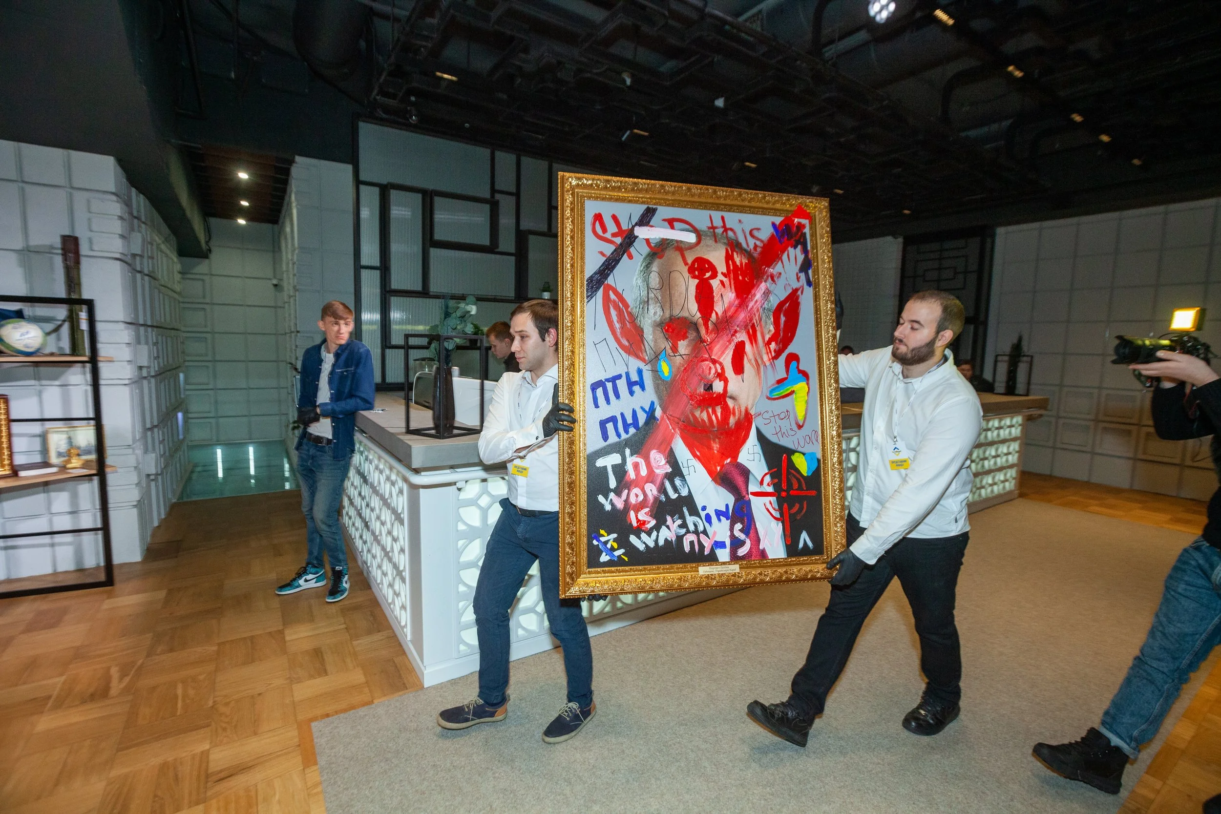 At a charity auction for displaced families in Kyiv, we created a private space hidden behind velvet curtains. Inside, guests found themselves standing directly before a museum-quality portrait of the dictator.